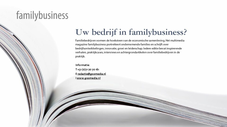 Familiebedrijven vormen de hoeksteen van de economische samenleving. Het multimedia magazine familybusiness portretteert ondernemende families en schrijft over bedrijfsontwikkelingen, innovatie, groei en leiderschap. Iedere editie bevat inspirerende verhalen, praktijkcases, interviews en achtergrondartikelen over familiebedrijven in de praktijk.