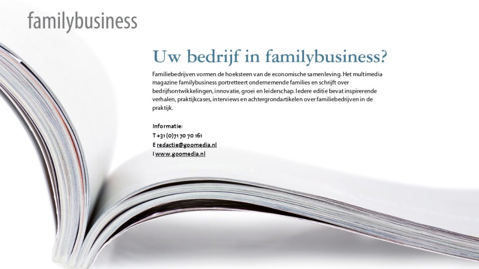 Familiebedrijven vormen de hoeksteen van de economische samenleving. Het multimedia magazine familybusiness portretteert ondernemende families en schrijft over bedrijfsontwikkelingen, innovatie, groei en leiderschap. Iedere editie bevat inspirerende verhalen, praktijkcases, interviews en achtergrondartikelen over familiebedrijven in de praktijk.